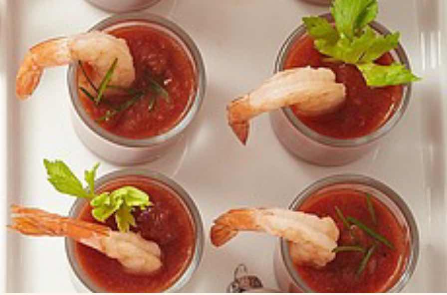 These savory tomato shooters—reminiscent of chilled tomato gazpacho, are the perfect way to start a summer party.